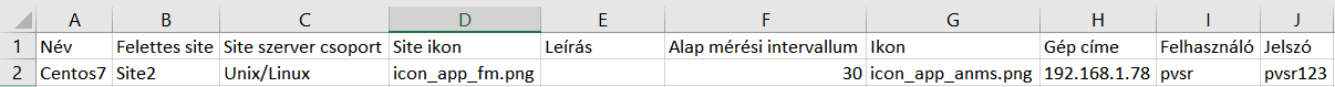 60. ábra Több eszköz felvétele felderítéssel II. 6.5.1.2 File feltöltéseEbben az esetben az Eszköz felderítése opciót „File-ból”-ra kell állítani. Két féle file típust lehet feltölteni a rendszerbe Szöveg file Ilyen esetben egy szöveg file-t kell megadni, amelyikben a mező elválasztó karakter „;”. A file-ban négy oszlopnak kell lennie, sorrendben: eszköz név, leírás, IP cím és site név (azaz a sorrend nem egyezik meg a fenti táblázatban lévő sorrenddel). A feltöltés eredményeképpen a fenti ábrán látható szerkeszthető táblázatot kapjuk XLSX file A feltöltendő file egy XLSX formátumú Excel file. Az alkalmazás ebben keresi a PVSR nevű lapot, vagy az első nem rejtett lapot, ha ilyet nem talál. A lap első sorában az oszlopok neveit kell felsorolni. Az oszlopok egy része rendszer szintű (mint például az eszköz neve), ezeket mindig olyan nyelven kell megadni, mint az éppen használt PVSR felület nyelve. A többi oszlop olyan felhasználó által definiált attribútum, amelyet lehet szerkeszteni a felületen, azaz nem lehet megadni se felderíthető se külső attribútumot. Ezeket az attribútumokat olyan névvel kell szerepeltetni, ahogyan a felületen láthatók. A rendszer szintű attribútumok az alábbiak: · Eszköz paraméterek o Név o Leírás o Alap mérési intervallum o Ikon · Site paraméterek o Felettes site o Site ikon o Site szerver csoport Az alkalmazás figyelmen kívül hagyja ilyen esetben a feltöltő oldalon megadható site ikon, szerver csoport és felhasználói attribútum értékeket, mivel ezeket minden eszközre külön meg lehet adni az XLSX file-ban. Egy minta XLSX file: