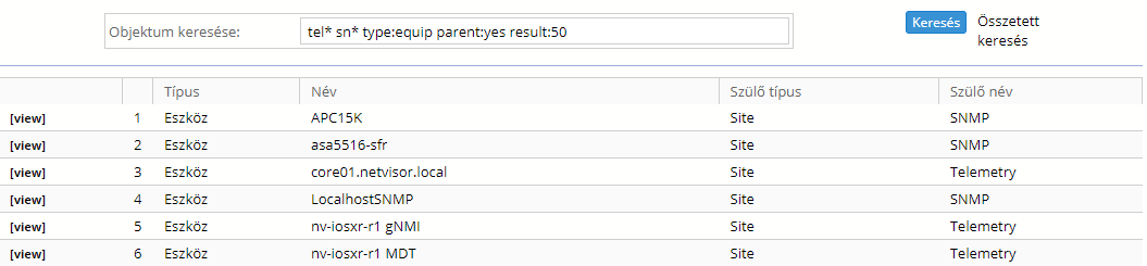 d. Kivéve: Azok a mezők (a formátum megegyezik az előzőnél megadottal), amelyekre NE keressen a rendszer e. Típus: a keresendő objektum típusa. Eszköz, Eszköz template és mérés típus esetén altípus is megadható. f. Találatok száma: a visszaadott találatok maximális száma A rendszer lehetőséget biztosít akármelyik paraméter alapján történő keresésre, de a Mező legördülő paraméterrel ezeknek csak egy részét lehet elérni. Minden egyéb esetben az „Egyszerű keresés” módot kell használni, és a mezőt a field:mező_neve_az_adatbázisban módon kell megadni. Például ha egy objektum (például site) ikonja alapján akarunk keresni, akkor a „field:icon” formulát kell használni. Az alábbi keresés visszaadja azon eszközök listáját, amelyek szülő site-jának a neve vagy LAN, vagy T-vel kezdődik, és SNMP típusúak.