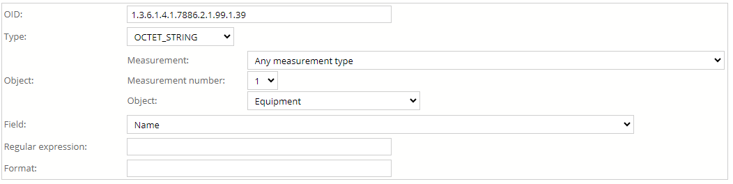 Figure 43. Measurement trap element · Field: which field of the object has to be used. The possible values depend on the type of the object, while in case on a constant type this is a text field which contains the string to be sent Each element – if it isn’t a constant – has two other optional fields: a regular expression and a format parameter. With the help of the regular expression it is possible to check the value of the field or to split it up into several pieces. The format parameter can be used to modify/customize the data before sending it out: it can contain any text and with the help of the elements $1, $2, … it can contain the values of the match groups in the regular expression. For example if the threshold has a parameter with the value „switch1.intranet.company.local”, the expression is „([^.]+)” and the format is „Eq: $1”, then the value „Eq: switch1” will be sent out. |