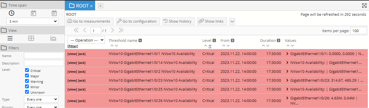 The Unknown level means that a measurement has one or more threshold definitions, but none of them could be violated because the measurement itself is not successful. This can happen in two cases: either there is a problem with the measurement or the application cannot access the equipment at all. This later case might cause that all of the Unknown thresholds will be violated for an equipment. The UI offers a way to group these Unknown alarms together so the users can distinguish between these two cases.