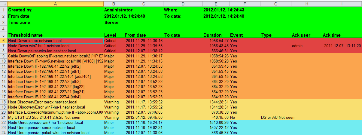 As can be observed, the generated XLS file containing the measurement data also includes the name of the threshold “.hu RTT > 2 sec”, and the background color of the data cells that violate the threshold matches the color code of its severity level. If threshold violation occurred, but that value was not taken into account in the current alarm, then the background color of the cell is set to cyan.