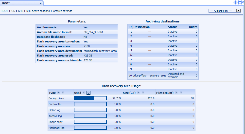 The page shows two or three tables. The first contains basic archive settings and the second the configured archiving destinations. The third is only shown if the flash recovery area is enabled in the database: in this case it shows its usage by the different data types.